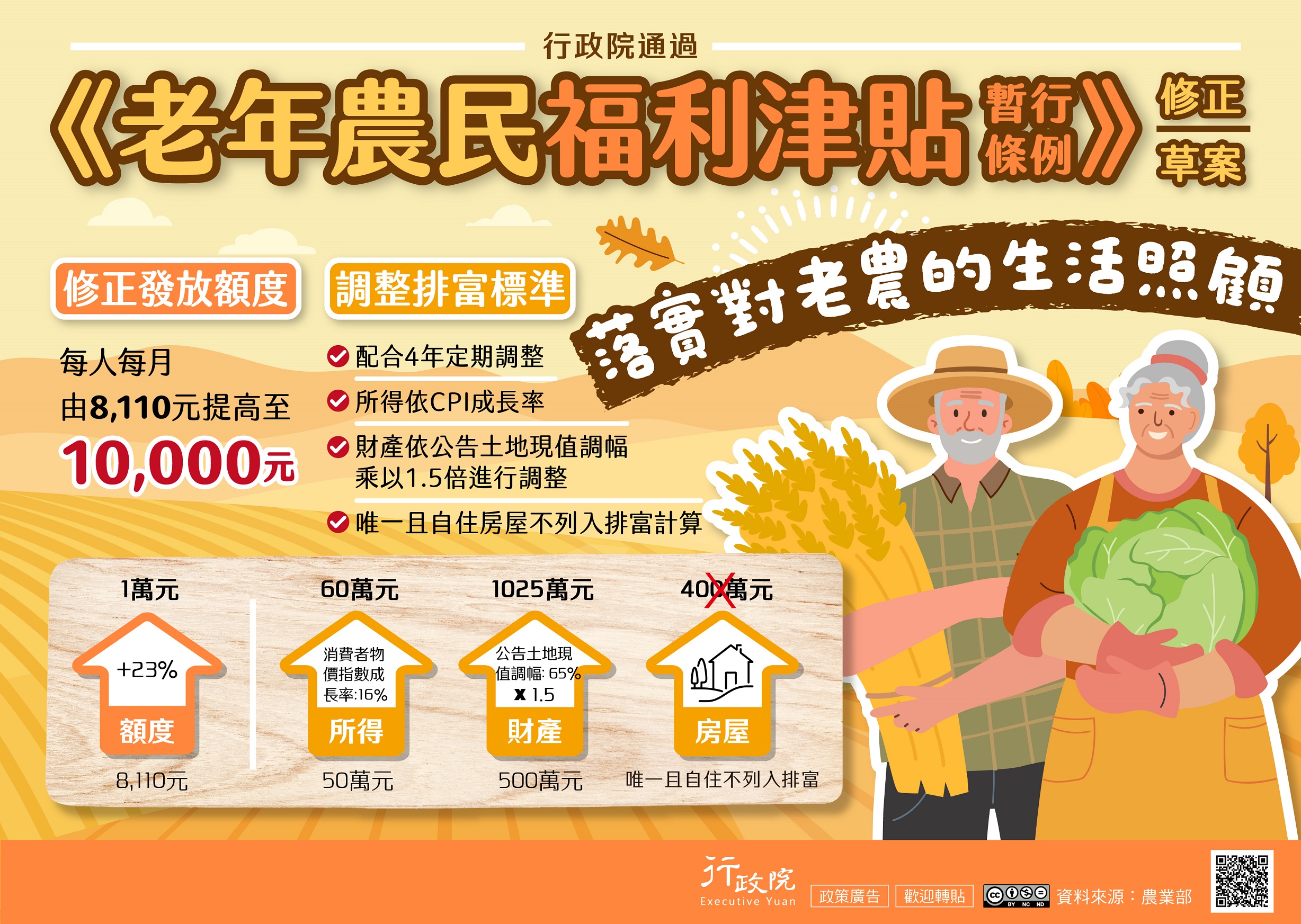 - 11 行政院推廣「老年農民福利津貼暫行條例修正草案」政策電子圖文說明,請民眾參閱。